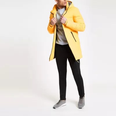 Topman mens grey longline puffer jacket. Asos design longline puffer jacket with hood in black. A modern mans go to when the cold weather hits this puffer jacket features a longline silhouette with front zip fastening. The design is crafted from a smart.